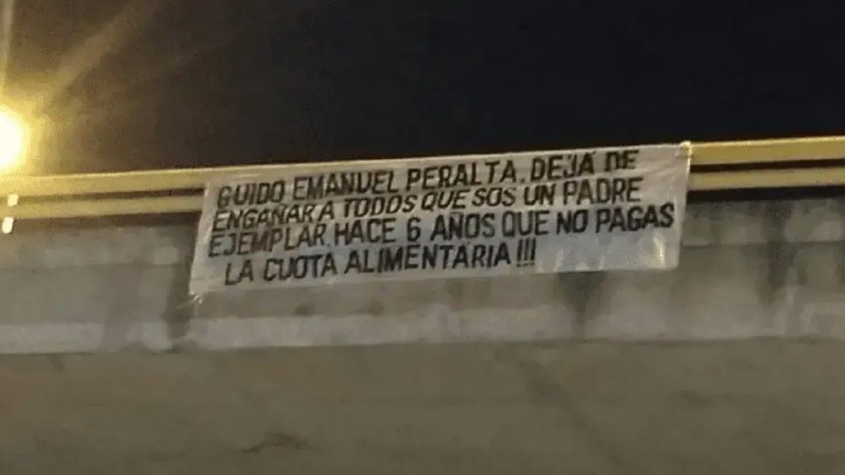 “Guido Emanuel Peralta dejá de engañar a todos que sos un padre ejemplar. ¡Hace 6 años que no pagas la cuota alimentaria!”, fue lo que escribió la santiagueña en el pasacalles que puso en el puente peatonal ubicado en inmediaciones de las avenidas Belgrano y Lugones.