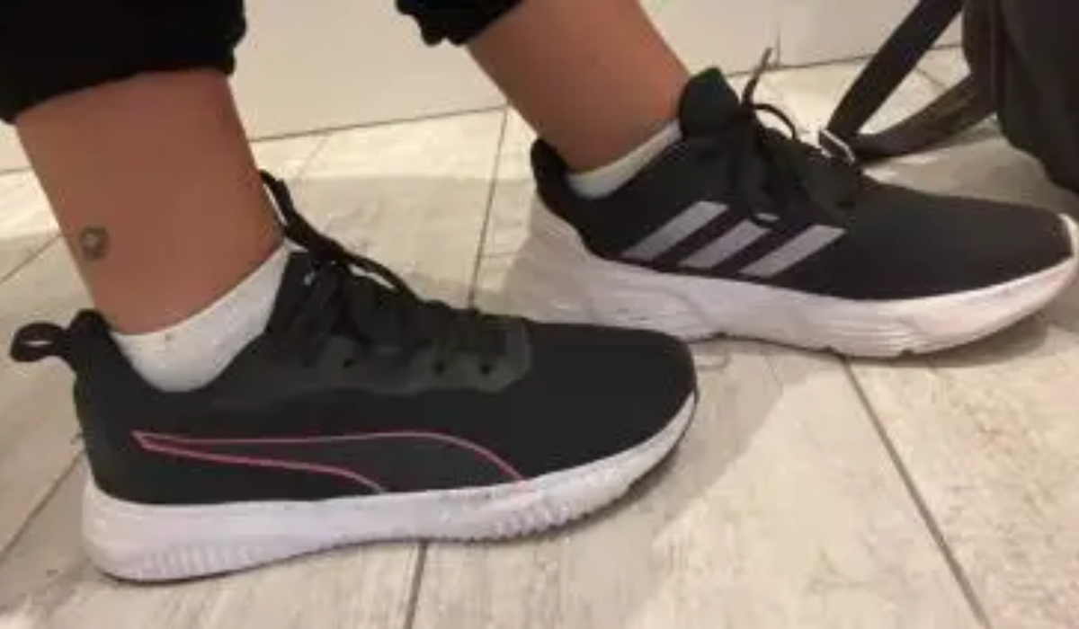 En cuanto a la zapatilla, se trata de dos marcas distintas que comparten prácticamente el mismo diseño y color: las dos son deportivas de lona negra, cordones negros y suela blanca. Medían exactamente lo mismo y a simple vista parecen idénticas.